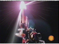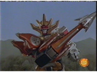 Wild Force Megazord Spear Mode charges up the Giraffe Spear, then fires it forth, which repeats, as the Giraffe Spear ignites with flames. |