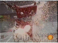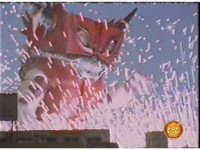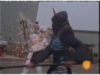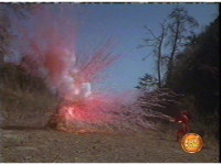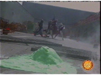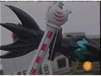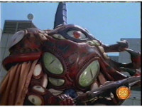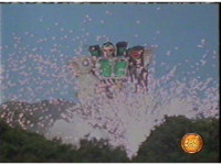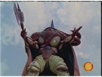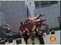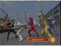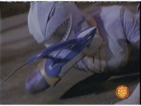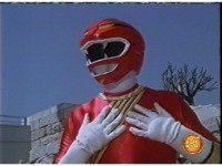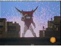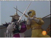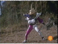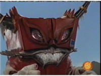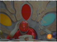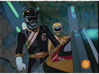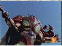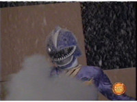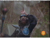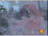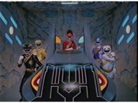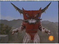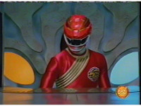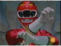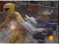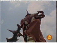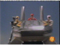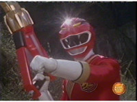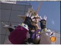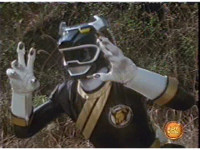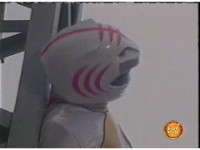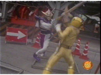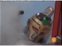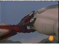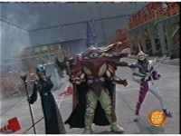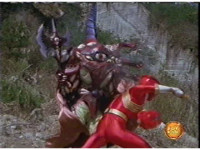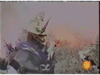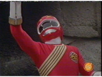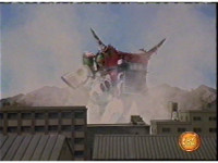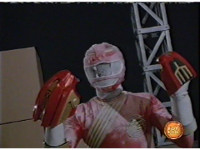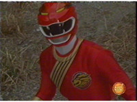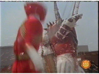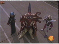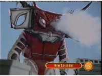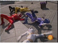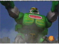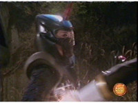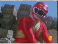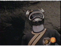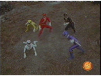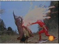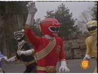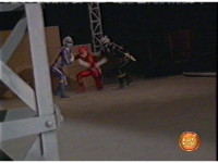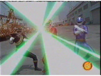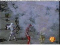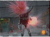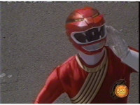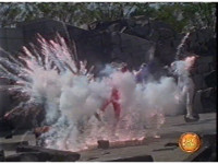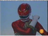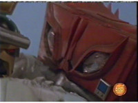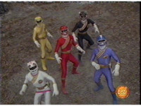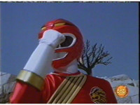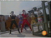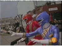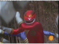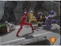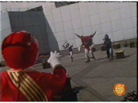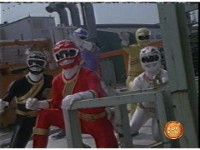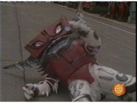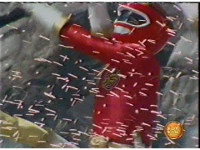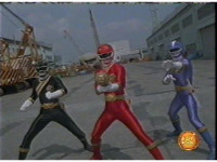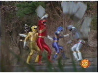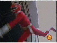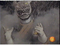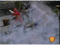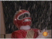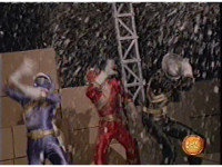 Red rushes in to attack Freezer Org, but he strikes first, beating Red back until he falls into a warehouse. Blue & Black rush in to join him, Red recovers, then the Org sprays frost mist, which turns to snow, falling upon the three Rangers, Red struggling with it. |