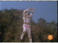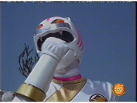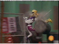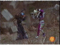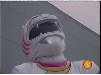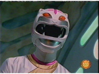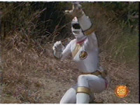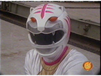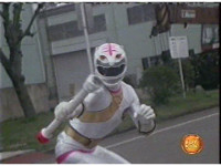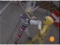 White struggles, then drops her Baton as she's lifted up into the air, and flung into a girder, and released, causing her to fall to the ground, where Toxica rushes at her and strikes, only to have her staff blocked by the Ranger, who talks. |