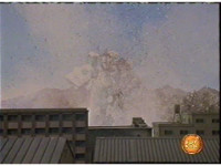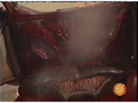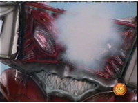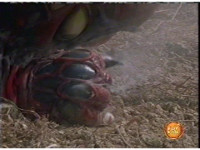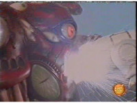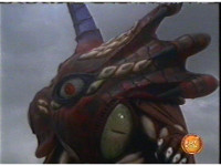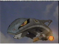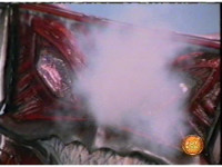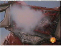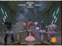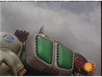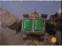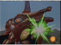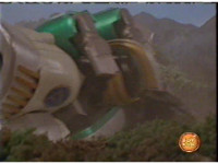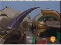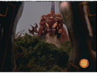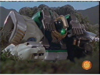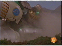 Retinax eyebeam blasts Kongazord sparkily, shaking up the Rangers in the cockpit, as the Kongazord falls over, depositing the Rangers onto the ground, Red quickly getting up and talking angrily. |