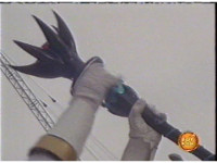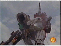 Freezer Org opens his face plate and sprays frost mist down at the Rangers, who eventually dive out of the way, where Yellow pulls out her Bear Crystals, Blue & White take them and put them into their Crystal Sabers, Red putting his Gorilla Crystal in his, and all five summon their Wildzords. |