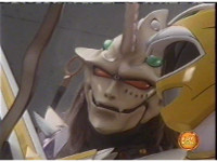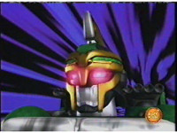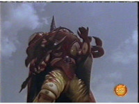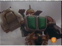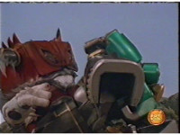 Retinax gestures his axe while talking, then Kongazord comes up on him, grabs his horn, Red works the controls, and Kongazord flips Retinax over. |