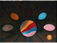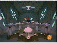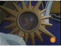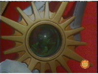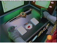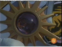 The Rangers glance about the frozen cockpit. Push in on Retinax, talking and gesturing his axe. Red speaks, then pulls his Crystal Saber out of the slot, finding the Crystal is left behind. Same goes for the other Rangers, Yellow talking about it, then Red picks up his frozen Crystal. |
