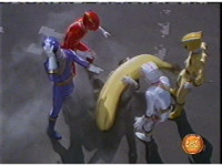 Spark bursts erupt around Freezer Org as Gorillazord tosses more bananas, until one falls onto Black, pinning him down as his teammates gawk. |