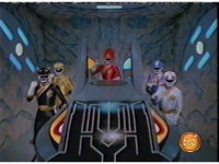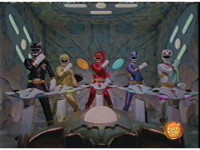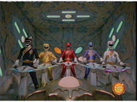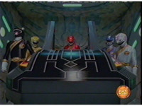 Zoom out from Red, as the Rangers talk and gesture in unison in the Soul Birded cockpit. |