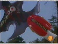 Red whips out the Lion Blaster, aims it at Freezer Org, firing green bolts sparkily at him. |
