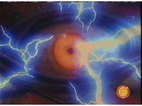 Amid a warping spectrum for a background, Red fires the Lion Blaster Cannon Mode, unleashing a spiraling ball of red & gold energy. |