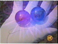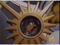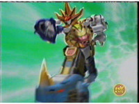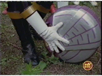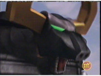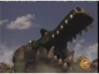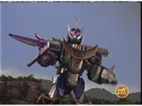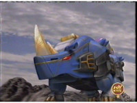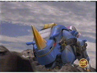 Black's Bison Crystal gleams, he talks to it, Bisonzord appears briefly bellowing, as the Armadillozord rolls towards the Rangers, coming to a stop at Black's feet, where he picks him up, shows him to the others, then his eyes flash and a pair of Animal Crystals appears in Black's palm. He talks to Armadillozord, who responds, before glowing and taking to the skies, where he grows to full size, and lands atop the Rhinozord's back. |