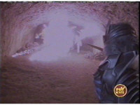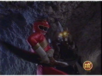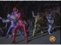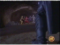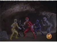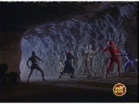 The Rangers retreat into a cave, backing up posed as Zen-Aku approaches. |