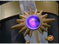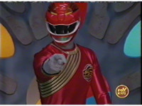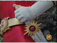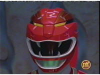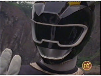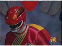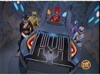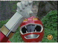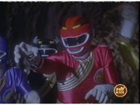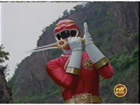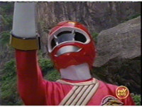 The Rangers react, Red pulls out his Saber and talks, Black responds and puts his Rhino Crystal into his Saber. |