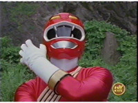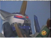 Red jerks to the side, as Wild Force Megazord Striker Mode dodges the Predator Wave, narrowly avoiding an explosion as the result, so the Megazord then poses battle ready. |