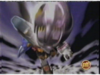 Wild Force Megazord Striker Mode bounces Armadillozord around like a soccer ball, until he lands in its foot as it poses amid the stadium. |