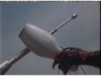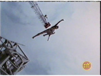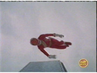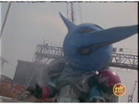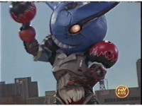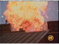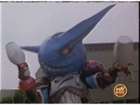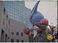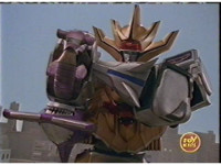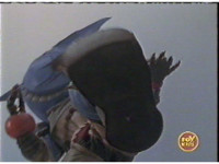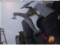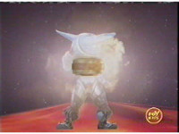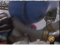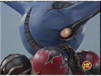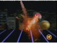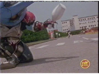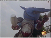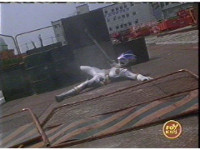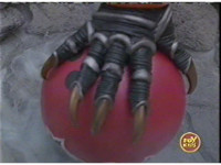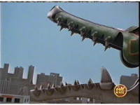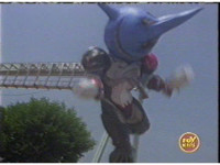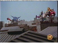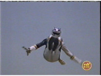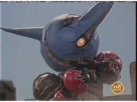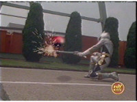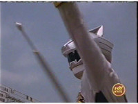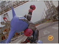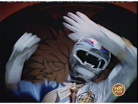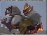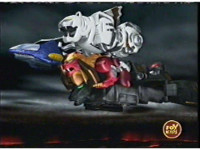 Bowling Org prepares his ball, poses a bit, then bowls at the two Megazords, striking Wild Force Megazord with the ball, sending it flying into the air where it explodes tremendously, sending all five Wildzords flying in all directions, while the Rangers fall to the ground. |