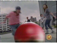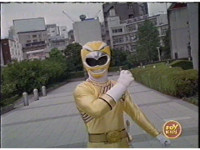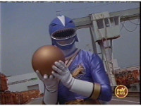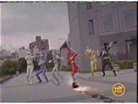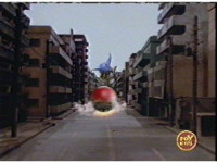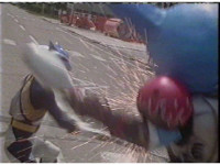 The two balls collide, the golden one winning out, sending the other into Bowling Org explosively, flipping him over. Blue talks and gestures, the Org recovers and talks, then the other five Rangers regroup with Blue, who talks and gestures. |
