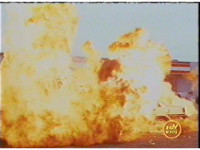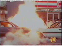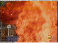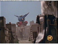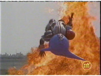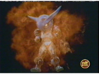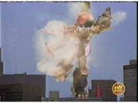Wild Force Megazord Predator Mode catches the Armadillo, Blue speaks quickly, Bowling Org staggers forth, talking, before collapsing and exploding massively before the Megazord, the Rangers all making celebratory gestures. |