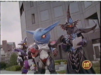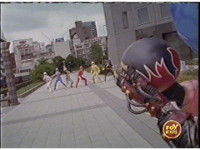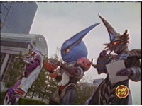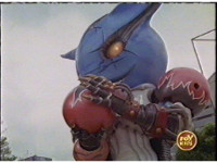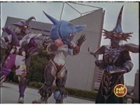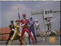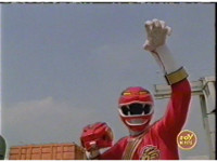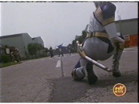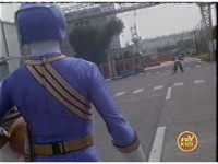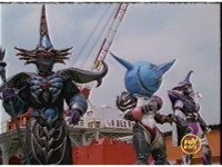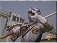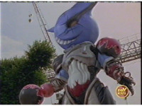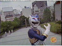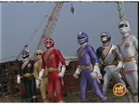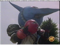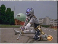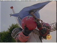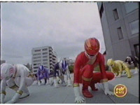 Bowling Org tries to stomp on the Rangers, but they dive out of the way, where they talk amongst themselves a bit, Lunar Wolf talking up to Alligator Wildzord, who appears dazed, as does Blue to Sharky and White to White Tiger, then Red has something to say. |