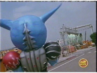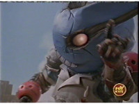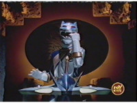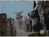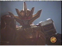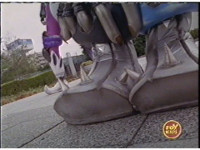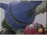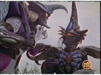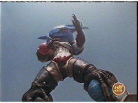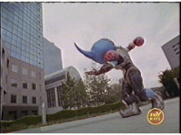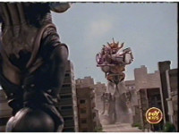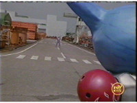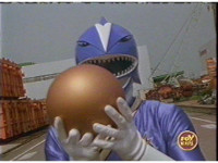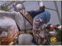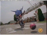 Wild Force Megazord Predator Mode grabs the rolled-up Armadillozord like a bowling ball, faces off with Bowling Org for a moment, then the Org begins to bowl. |