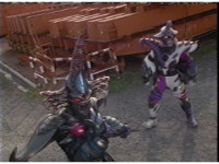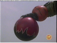 Clashing pins to Cue, Lunar Wolf fights Bowling Org, sparkily slashing each other, until the Ranger bounces off a railing and double kicks the Org away, but he recovers and they both talk, until the Org readies his bowling ball. |