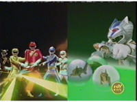 The Rangers Savage Slash the Jungle Sword, while Lunar Wolf Lunar Breaks his three Crystals in Laser Pool. |