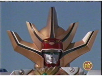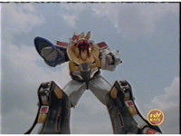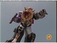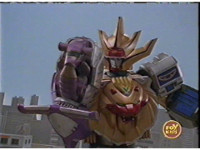 Red Lion roars, Bison's back shifts around into legs, Eagle locks in her wings behind Red Lion's chest head, causing the Wild Force Megazord's head to pop up out of her, eyes glowing. |