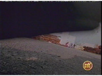 The ball flies right into the open Gator mouth, sending Predazord flying back, where it explodes in the sky, the three Wildzords flying off, Lunar Wolf falling out of the cockpit, where the Rangers regroup around him, and he talks upward. |