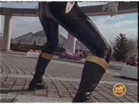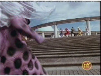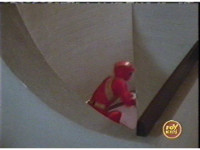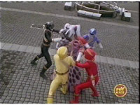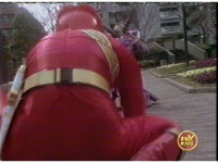 Wedding Dress Org carries a woman over her shoulder, when Red stops her as he and his teammates appear, Red talks to her, she talks back, then she races off, the Rangers giving chase. |