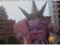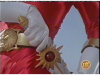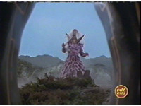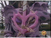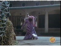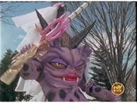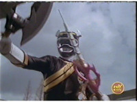 Wedding Dress Org speaks and fires eyebeams, which the Wild Force Megazord Sword & Shield Mode blocks, bursting harmlessly around it, before White gestures and nod-talks. The Megazord begins to spin around, slashing the Org repeatedly until she falls down, but recovers. |