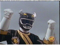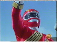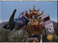 Red Lion roars, Bison's back shifts around into legs, Eagle locks in her wings behind Red Lion's chest head, causing the Wild Force Megazord's head to pop up out of her, eyes glowing. |