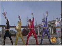 Red Lion jumps forth with ignited back thrusters, he then shifts about, Shark, White Tiger, and Eagle doing the same, all connecting together atop Bison. |