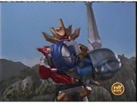Wild Force Megazord in Sword & Shield Mode lowers arms victoriously. |