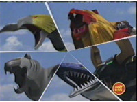 Zoom out from Red as the Rangers gesture, Wild Force Megazord Predator Spear Mode readying spear arm, and firing it forth. |