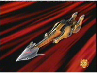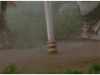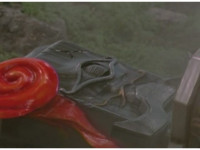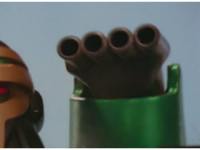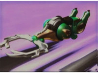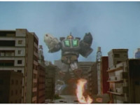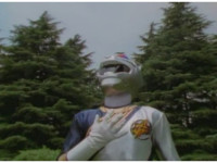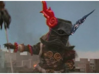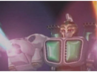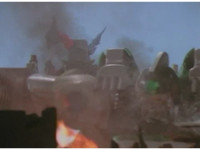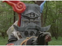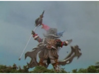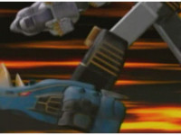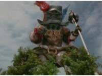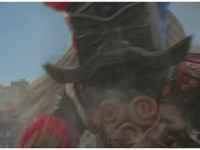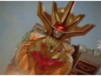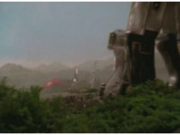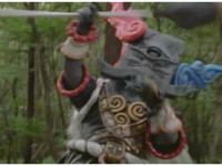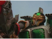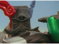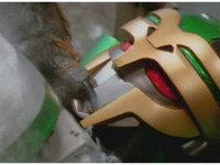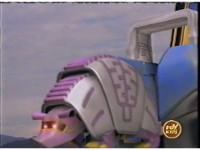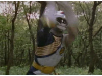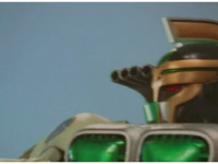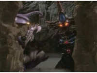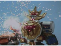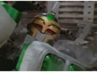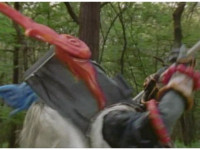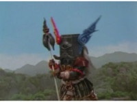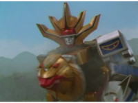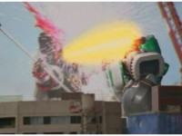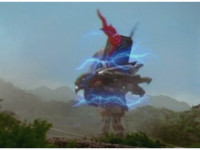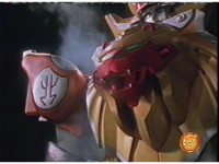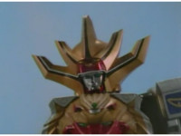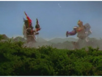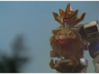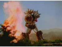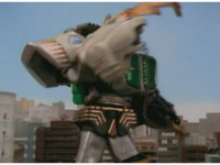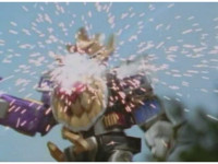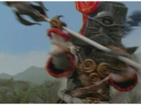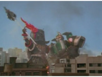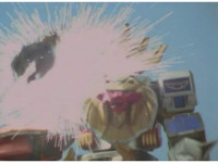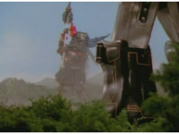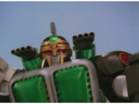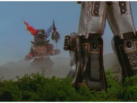 Tombstone Org keeps a hold of Kongazord, preparing to hit it with his spear, when Red speaks, then Kongazord fires its shoulder cannons at the Org, bursting him back until he drops his spear. |