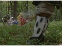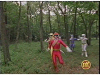 The Rangers race forth as the camera tracks toward them in the woods. |