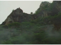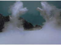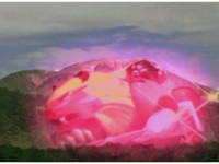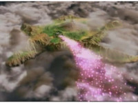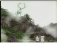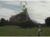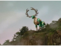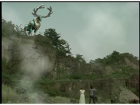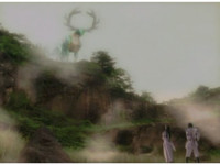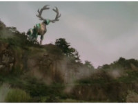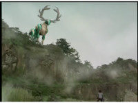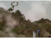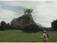 Pan across a mountain range, to a pair of antlers sticking out of the clouds, as the Deerzord opens her eyes. |