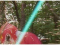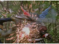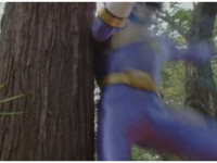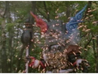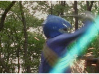 Tombstone Org twirls his spear, sparkily slashing each Ranger with energy trails, finally sending Blue flying into a tree, where his teammates then regroup around him. |