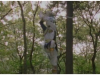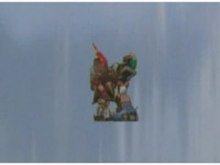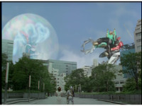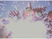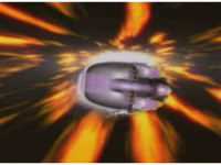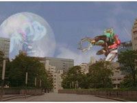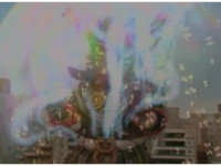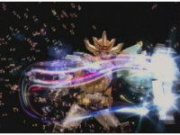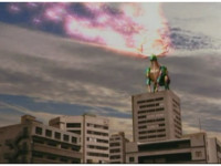 Wild Force Megazord Clutcher Mode poses, as the bubble-entombed Tombstone Org disintegrates, before the bubble full of energy flies off into the heavens. |