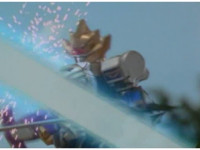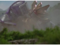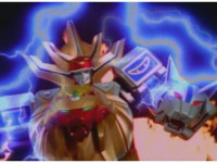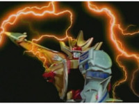 Tombstone Org readies his spear, then begins to slash it forth, sparkily striking the Megazord repeatedly until it falls down, Lunar Wold reacting. |