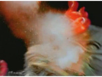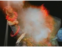 Tombstone Org lowers his arm, closes his eye, then collapses and explodes. |
