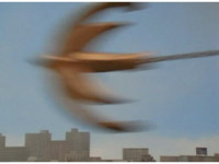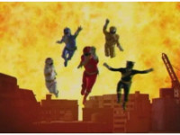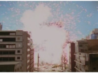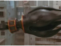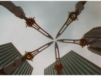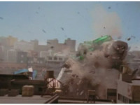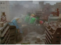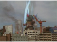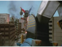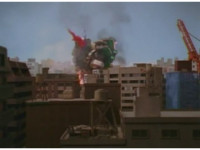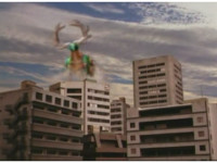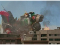 Kongazord with Tombstone Org goes all the way, then quickly comes back down upside-down, before both crash explosively into the city, sending the Wildzords flying apart, and the Rangers leap to safety. |