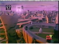 The camera passes over structures while viewing the exterior of Millennium City. |