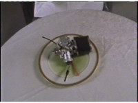 Mandilok prepares to eat a piece of metal on a dish, and talks about it. |
