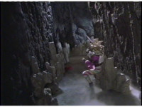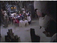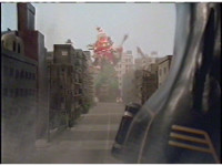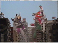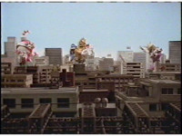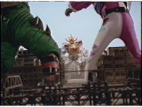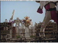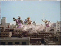 A gas cloud floats over from Jindrax to the Megazords, causing them to stop dead in their tracks. Jindrax talks, then shrinks suddenly, the Megazords reacting and looking at one another, the Rangers reacting, confused, and finally, Predazord & Wild Force Megazord just stand there, puzzled. |