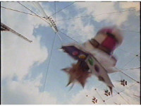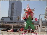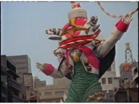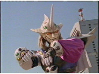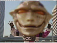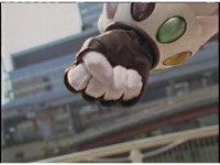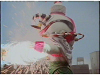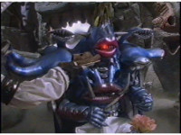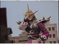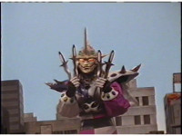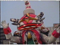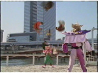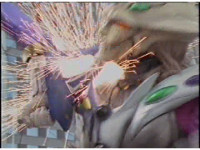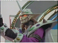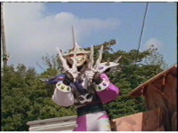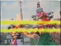 Juggelo tosses a hoop at the Wild Force Megazord, which repeatedly slashes the hoop to bits, Juggelo reacts, then the Megazord sparkily slashes him. |