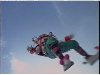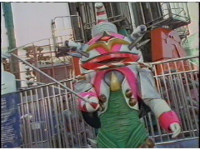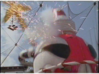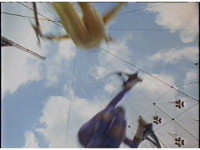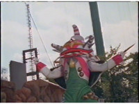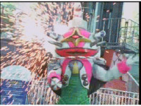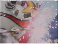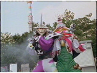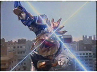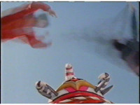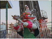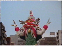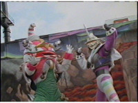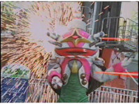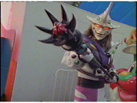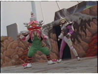 Jindrax joins Juggelo's side, they talk for a moment, then Jindrax flips over the Wild Force Megazord, lands on the other side, then Team Carnival begins to do their knife passing juggling trick again, sparkily striking the Megazord between them. |