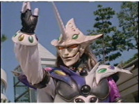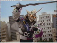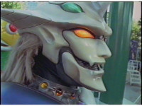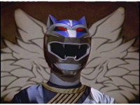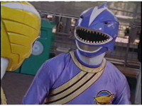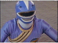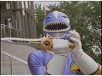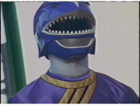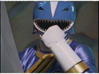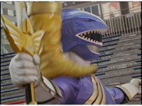 Wild Force Megazord passes its Fin Blade over its face, changing to a fierce expression. |