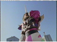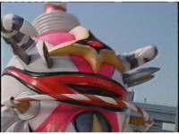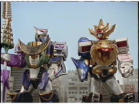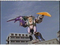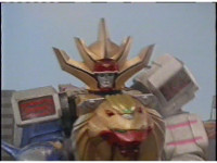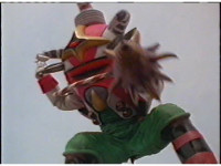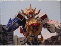 Eagle locks in her wings behind Red Lion's chest head, causing the Wild Force Megazord's head to pop up out of her, eyes glowing. |