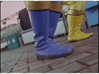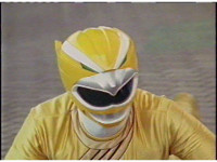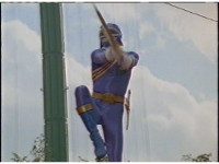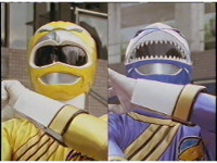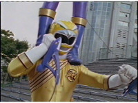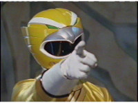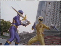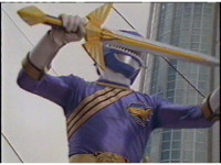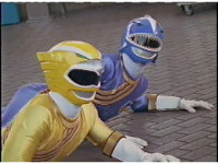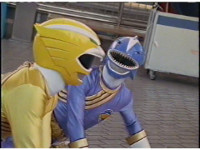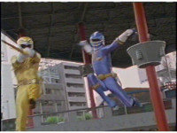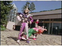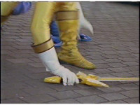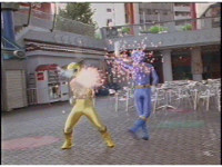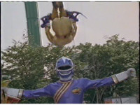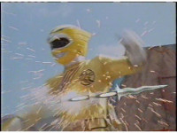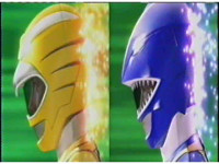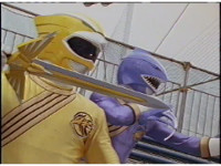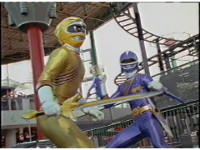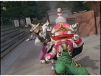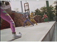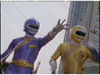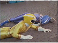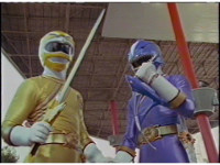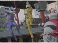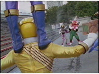 Blue & Yellow falls down, Juggelo points his foil forth and approaches, each Ranger then reacts. |