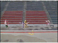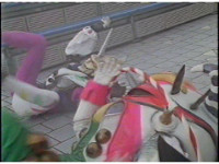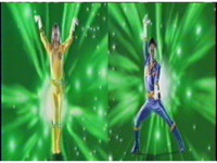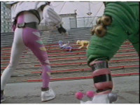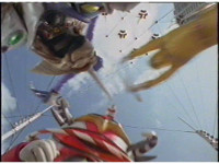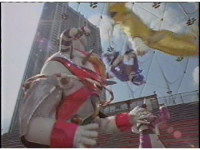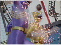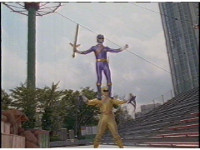 Yellow & Blue are knife-struck sparkily until they fall, landing in the bleachers again, Team Carnival posing at them, while the Rangers talk for a bit, before Blue & Yellow then leap up and over the Org brothers, sparkily slashing them down on the way by. |