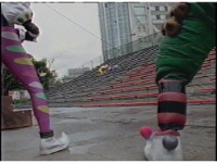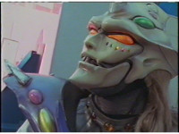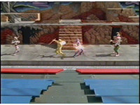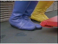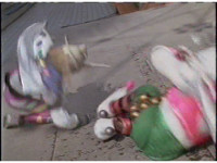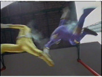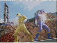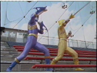 Yellow & Blue leap up at Juggelo, who tosses balls sparkily at their chests, knocking them into the bleachers, while he and Jindrax talk, Blue & Yellow then readying their weapons and charging in. |