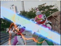 As the Rangers motion about, Soul Bird fires a beam of yellow swirling energy forth, which erupts as individual energy beams from each of the five Wildzord parts of the Wild Force Megazord. |